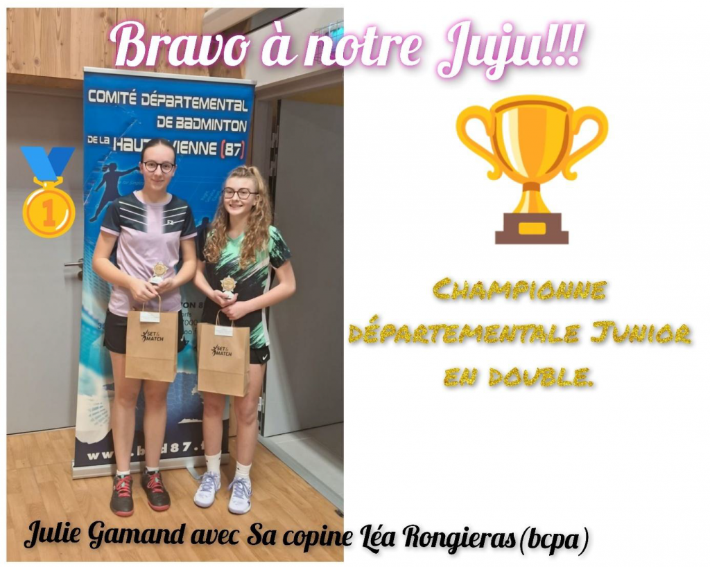 Les résultats sportifs ont également été au rendez-vous. Nous tenons à féliciter chaleureusement Julie Gamand, qui a été sacrée Championne Départementale Junior en Double avec sa partenaire Léa Rongieras. Bravo !