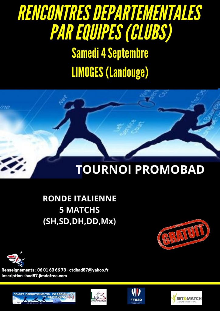 Le CODEP 87 organise des rencontres départementales GRATUITES (promobad) sous forme de ronde italienne le samedi 04/09 au Gymnase de Landouge à Limoges.