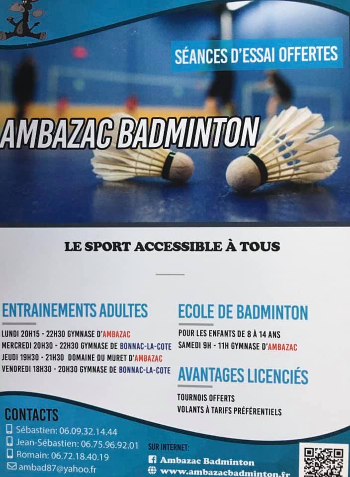- Samedi 8H30 - 11H école de bad au gymnase d'Ambazac