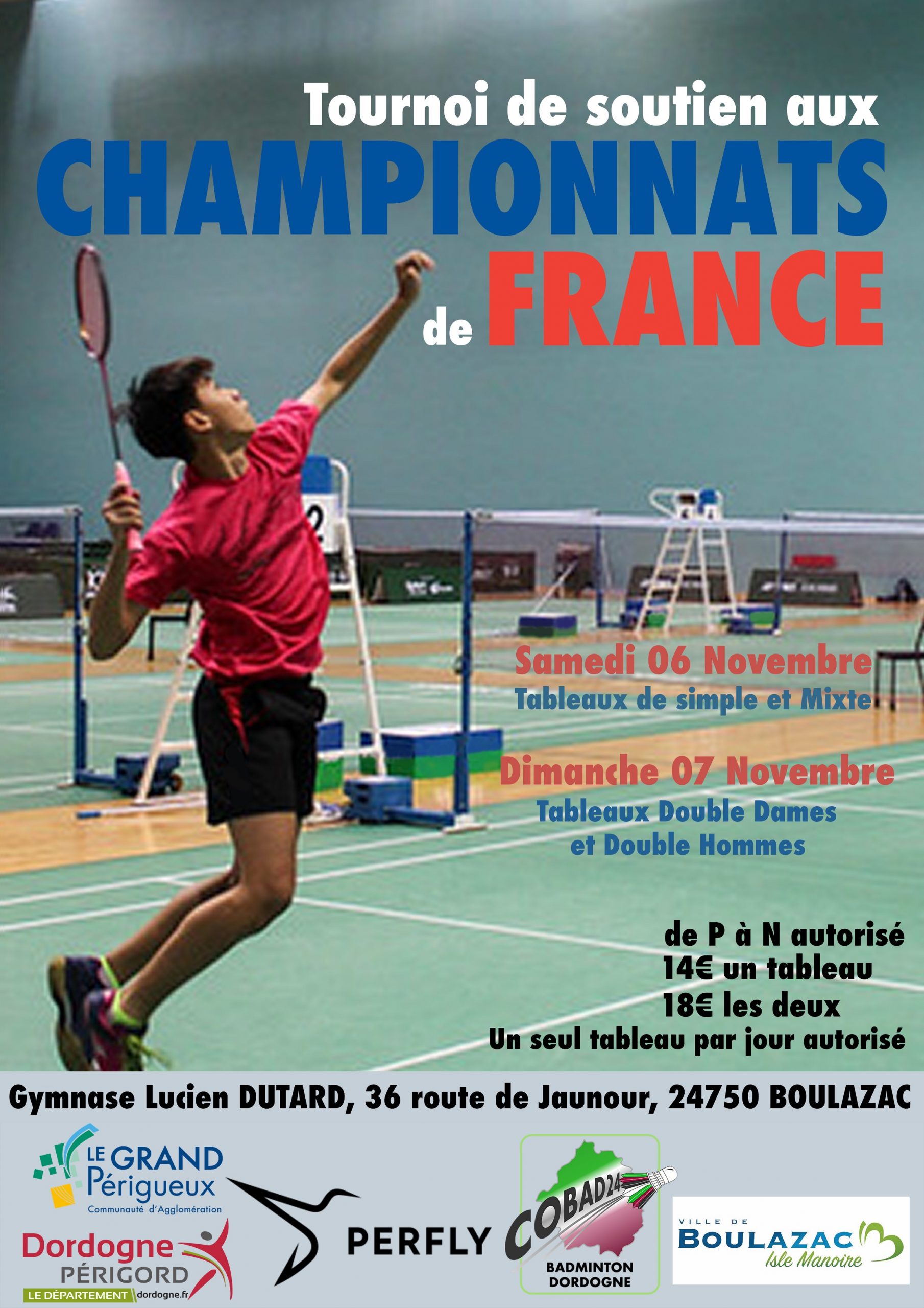 Samedi 6 et Dimanche 7/11 : Tournoi en soutien aux championnats de France à Boulazac (24). Simple et Mixte le samedi, double le dimanche. De P à N. Inscription par mail : ambad87@yahoo.fr avant le 22/10.