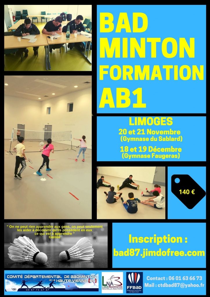 Une formation EB1 (3 modules) sera proposée à Limoges par la Ligue Nouvelle Aquitaine ainsi qu’une formation AB2J (2 modules), sur les dates suivantes : 15 et 16 janvier (module 1), 26 et 27 février (module 2), 19 et 20 mars pour le module 3 de l’EB1.