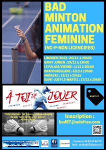 Afin d’encourager la pratique féminine, le comité départemental de la Haute-Vienne met en place 6 animations à destination d’un public uniquement féminin. Ces animations se dérouleront sur la période de novembre et décembre est seront ouvertes aux joueuses adultes NC – P et non licenciées. Lieux et dates : Limoges (SLG) : 26 novembre à …