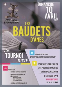 Ambazac Badminton est heureux de vous inviter à son 7ème tournoi mixte le dimanche 10 avril. Nous privilégierons les poules de 4 avec 2 sortants par poule. Le tournoi est ouvert aux joueurs de NC à R4. La date limite d’inscription est fixée au vendredi 1er Avril.