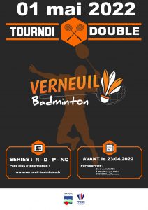 Dimanche 1er mai : 5ème tournoi double de Verneuil/Vienne. Tournoi sur 7 terrains. Tournoi chaleureux et convivial, ouvert de minimes à vétérans, de NC à R4 à 10 minutes de Limoges. Inscription par mail ambad87@yahoo.fr avant le 19/04