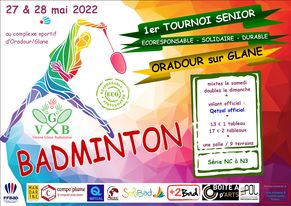 27 et 28 mai : 1er Tournoi Ecoresponsable et Solidaire (SOLIBAD) Sénior du Vienne Glanne Badminton (Oradour sur Glane 87). Le samedi 28 Mai 2022 se dérouleront les tableaux de double (Homme Femme) de NC à R4. Le dimanche 29 Mai 2022 se dérouleront les tableaux de mixte de NC à R4. Inscription par mail ambad87@yahoo.fr avant le 10/05.