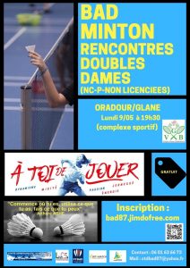 Bonjour, Suite au succès de la 1ère soirée de rencontres de doubles dames (non officielles) pour les joueuses NC-P et Non Licenciées, le Codep87 a le plaisir de vous informer que le club d’Oradour sur Glane, accueillera un 2ème temps de rencontres spécifiques pour les filles. Celui ci aura lieu au complexe sportif d’Oradour sur …
