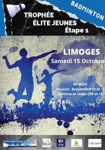 Bonjour à tous, Le Comité départemental organise la 1ère étape de notre Trophée Élite Jeunes (TEJ) qui débutera le samedi 15 octobre à Limoges au gymnase Faugeras. Il s’agit d’une compétition de simple, par poules de niveau de jeu, ouverte aux poussins, benjamins (P10 et +), minimes et cadets (D9 et + ). 4 étapes …