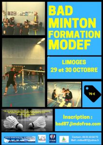 Le comité départemental de la Haute-Vienne (Codep87) a le plaisir de proposer des parcours de formation pour animation et/ou entraînement. L’inscription à ces formations d’encadrants sont payées par le Club. Si vous êtes intéressés, merci de nous adresser un mail : ambad87@yaoo.fr. Une formation Module d’Entrée en Formation (MODEF) : le 29 et 30 Octobre 2022. …