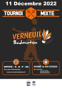 Dimanche 11 décembre : 8eme édition du tournoi mixte de Verneuil/Vienne. Tournoi chaleureux et convivial, ouvert de minimes à vétérans de NC à R4 sur 7 terrains. 14 euros l’inscription. Inscription par mail ambad87@yahoo.fr avant le 28/11