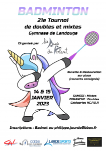 14 & 15 janvier : 21ème tournoi adultes de doubles et mixtes des Aces du Volant au gymnase municipal de Landouge – Rue Jean de Vienne – 87100 LIMOGES. Mixte le samedi, double le dimanche. 14 euros pour un tableau, 18 euros pour deux. Ouverts de NC à R4. Inscription par mail ambad87@yahoo.fr avant le 22/12.