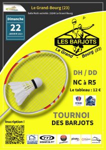 Dimanche 22 janvier : Les Grands Barjots de le Grand-Bourg sont heureux de vous accueillir à leur Tournoi de Double H/F au gymnase municipal de Grand-Bourg. Inscription : 12 euros. Inscription par mail ambad87@yahoo.fr avant le 03/01.