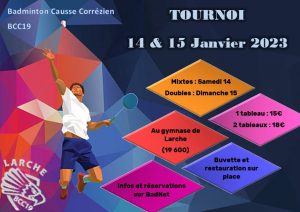 14 & 15 janvier : Tournoi de Larche du Badminton Causse Corrézien au gymnase du collège 24120 La Feuillade. Mixtes le samedi. Doubles le dimanche. 1 tableau 15 euros, 2 tableaux 18 euros. Inscription par mail ambad87@yahoo.fr avant le 03/01.