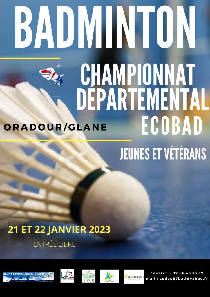 Le CODEP87 vous invite à participer au Championnat Départemental Ecobad Jeunes & Vétérans, le samedi 21 et le dimanche 22 janvier2023. Il se déroulera au gymnase d’Oradour-sur-Glane.
