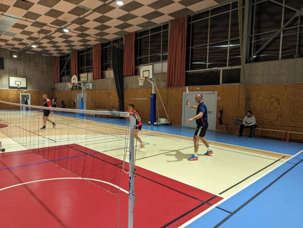 La rencontre débute par les doubles avec Carine & Nadège et Seb (finalement arrivé) & Thomas. Les filles débutent bien avec un premier set maîtrisé (21-11). Les garçons ont du mal à entrer dans leur match et s’inclinent (18-21). Les filles engagent le second set mais celui-ci se révèlera beaucoup plus compliqué. En retard à la pause, elles vont grappiller des points petit à petit et se battre jusqu’au bout pour arracher une victoire en deux sets (25-23)… ouf ! Les garçons vont reproduire le schéma du 1er set : un mauvais départ, une remontée progressive mais vont s’incliner une nouvelle fois (19-21). 1 – 1 après les doubles. Place au mixte et au simple homme.